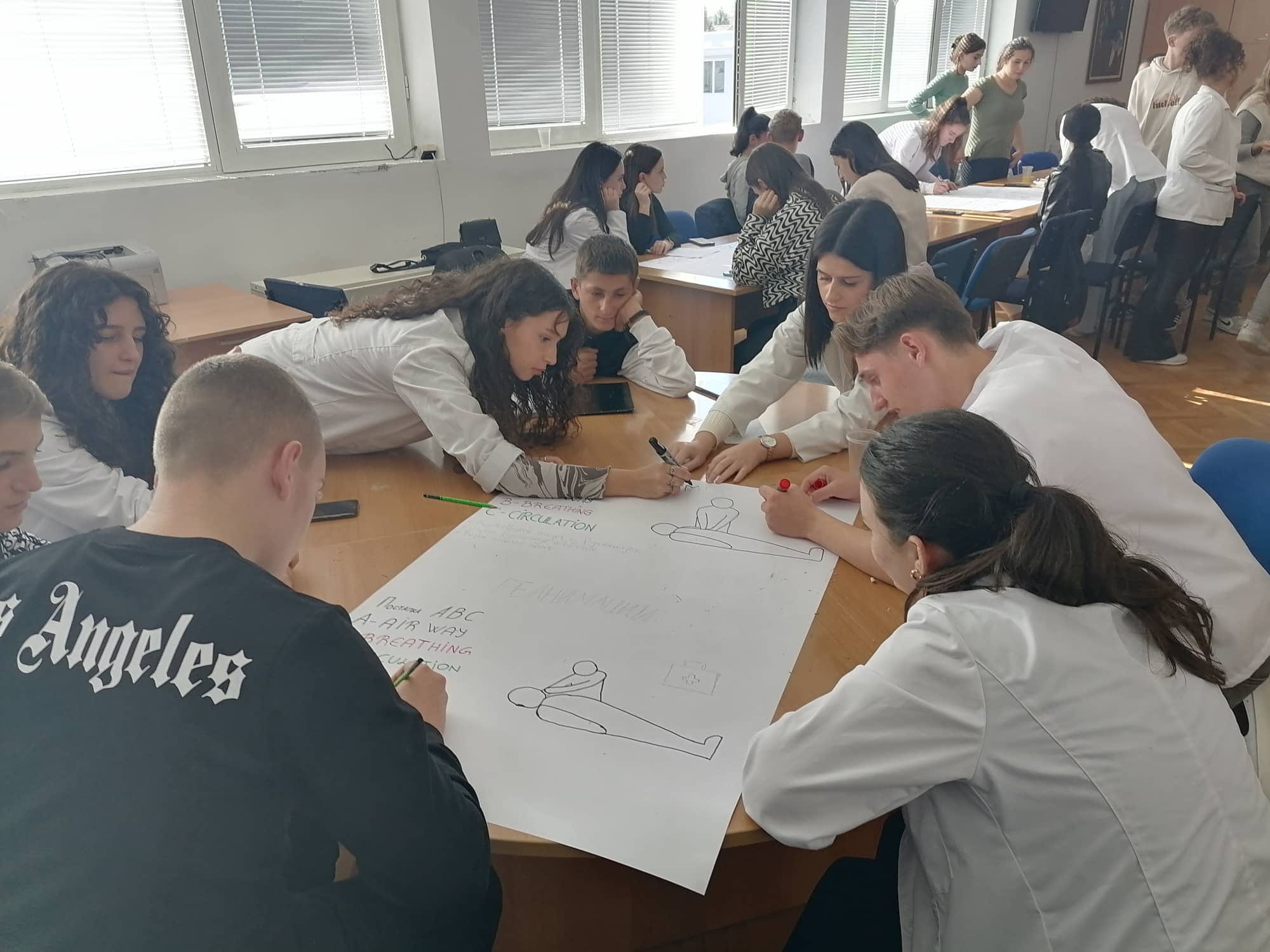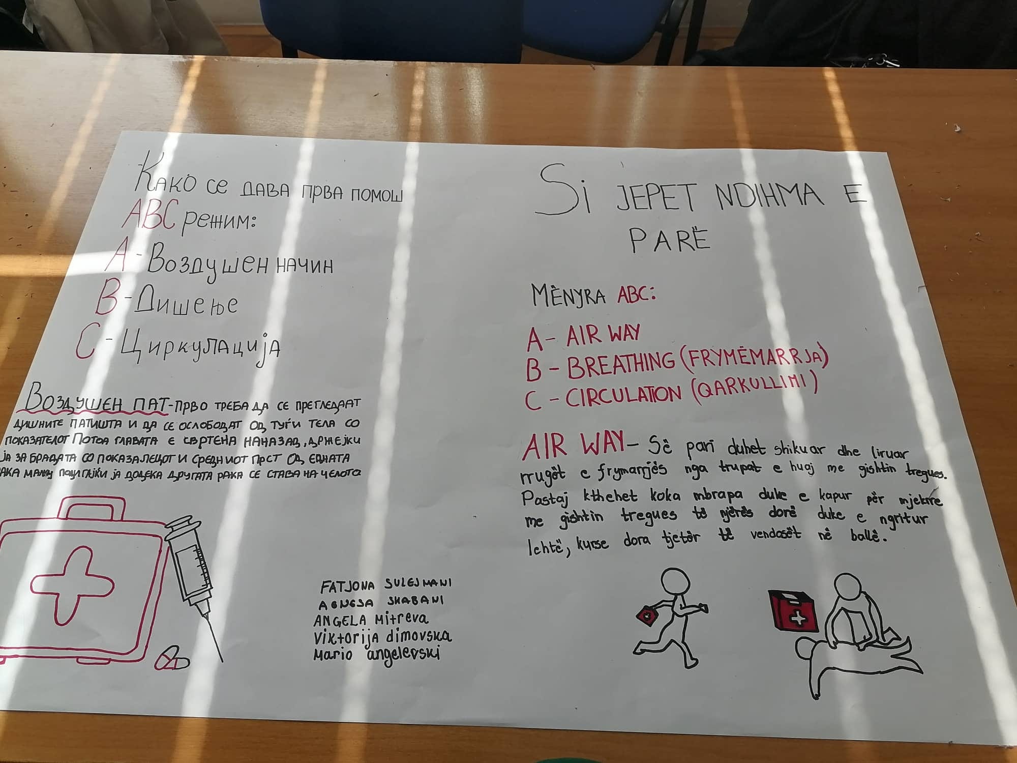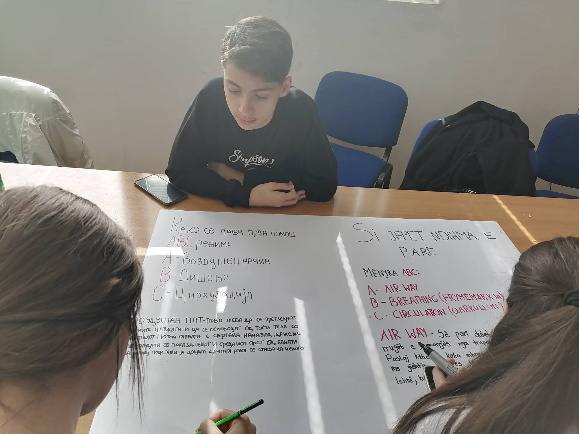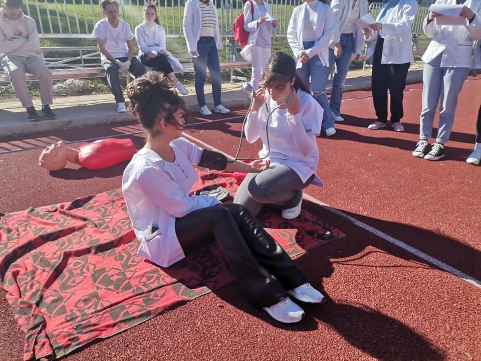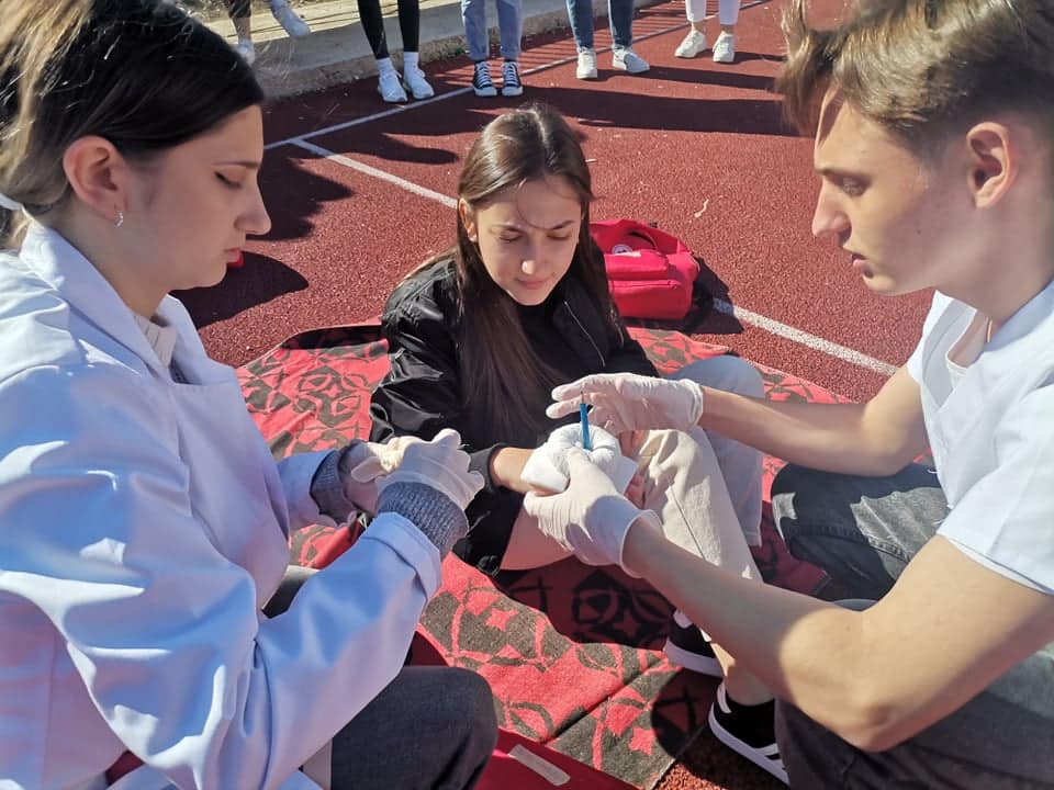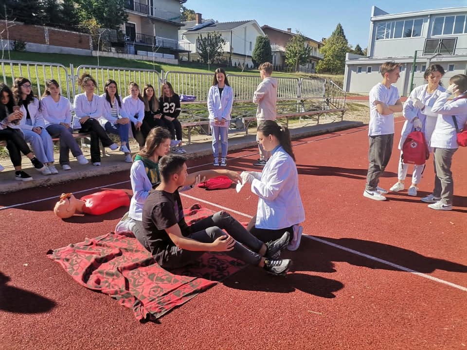 Во рамките на Проектот за меѓуетничката интеграција на младите вообразованието денеска учениците од нашето училиште ССОУ „КолеНеделковски“ заедно со учениците од партнер училиштето ОСТУ „НацеБуѓони“ во Куманово реализираа активност: Прва помош при повреда на лице место. На активноста беа присутни ученици од двете партнер училишта, директори, родители, претставници од тимовите за училишна интеграција, претседателот на Црвен Крст при ССОУ„ Коле Неделковски “ – Велес, наставници. Учениците најнапред презентираа како треба да постапат, односно да пружат прва помош во случај на: крварење, изгореници, шок состојба, потреба од вештачко дишење. Потоа учениците од медицинската струка при ОСТУ „Наце Буѓони“ практично презентираа давање на вештачко дишење, масажа и преврски. На крај беа изработени хамери од наученото одденешна презентација и практичните вежби. Следеше прошетка во Куманово, заедничко дружење и исчекување на следната средба, уште една од многуте реализирани од двете партнер училишта во изминатите десетина години.
