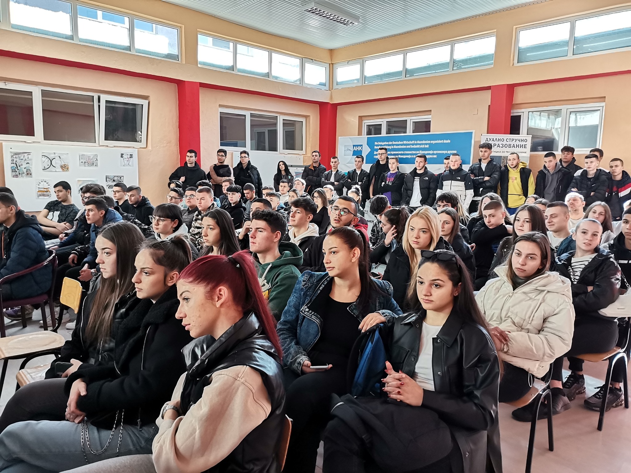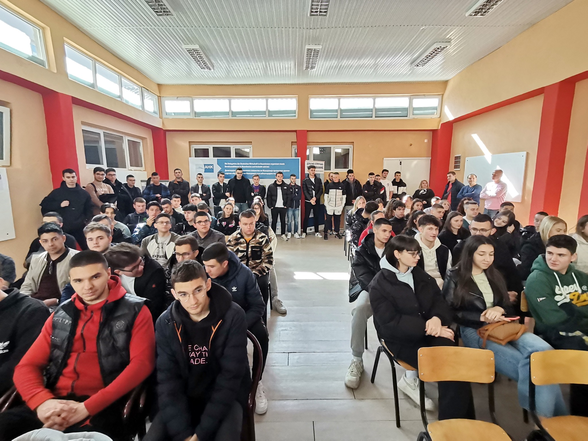 Денеска во мултифункционалната сала на училиштето свое претставување пред учениците од четврта година на образование имаа претставниците од Гарнизонот за обука на Армијата на Република Северна Македонија од Велес.