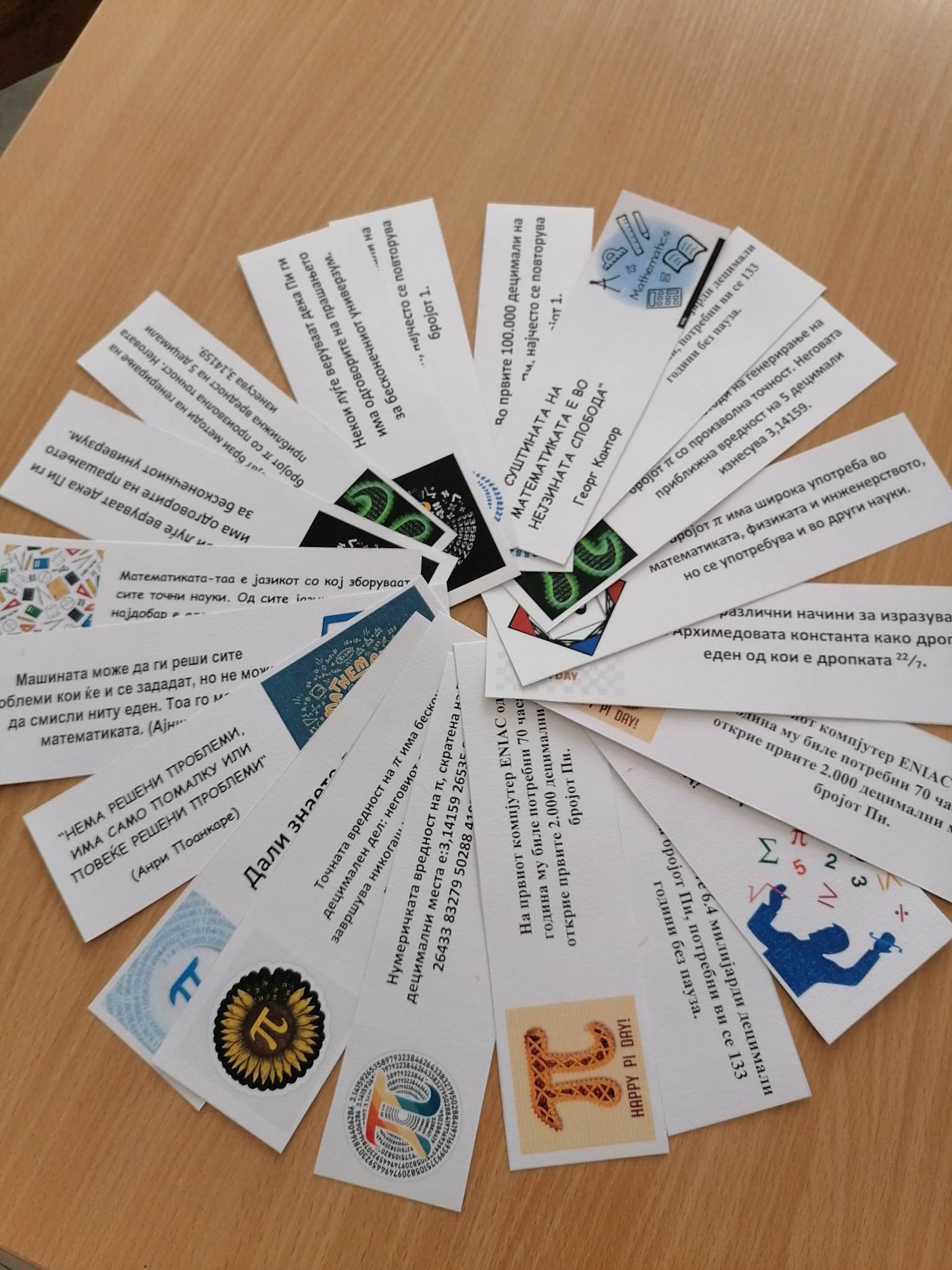 Нашите ученици подготвија предавање за примената на оваа математичка константа во математиката, како и во други науки. Беше презентиран огромниот интерес кај математичарите почнувајќи од античкиот период кога вредноста на овој број се пресметувала геометриски, па се до дигиталниот период кој се однесува на компјутерското пресметување на бројот π кога се постигнати пресметки со над милјарда децимални места. Учениците од профилот компјутерска техника и автоматика подготвија и поделија пораки за бројот Пи и за математиката, додека пак учениците од угостителската струка подготвија и послужија вкусни мафини и торта во чест на овој ден.