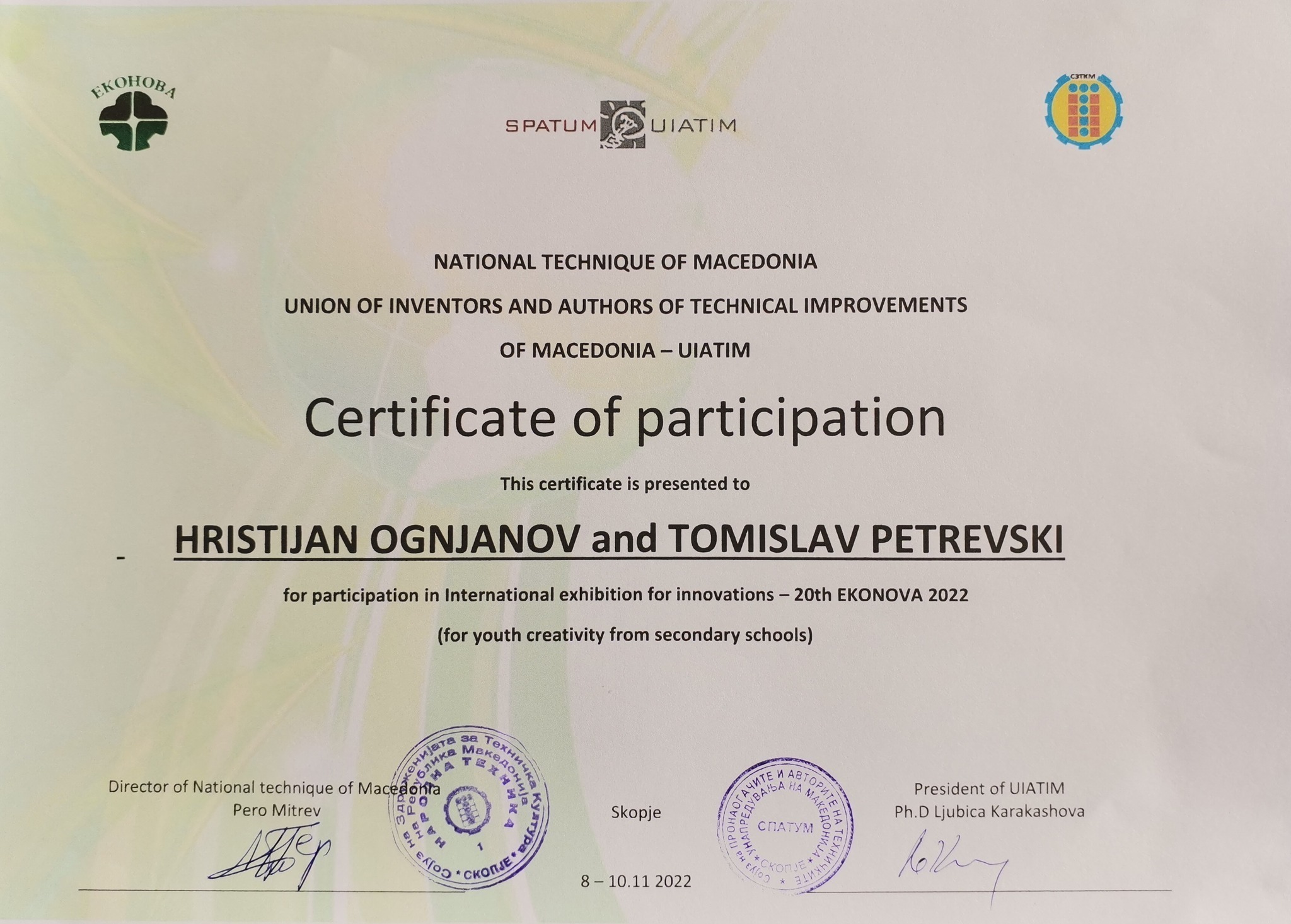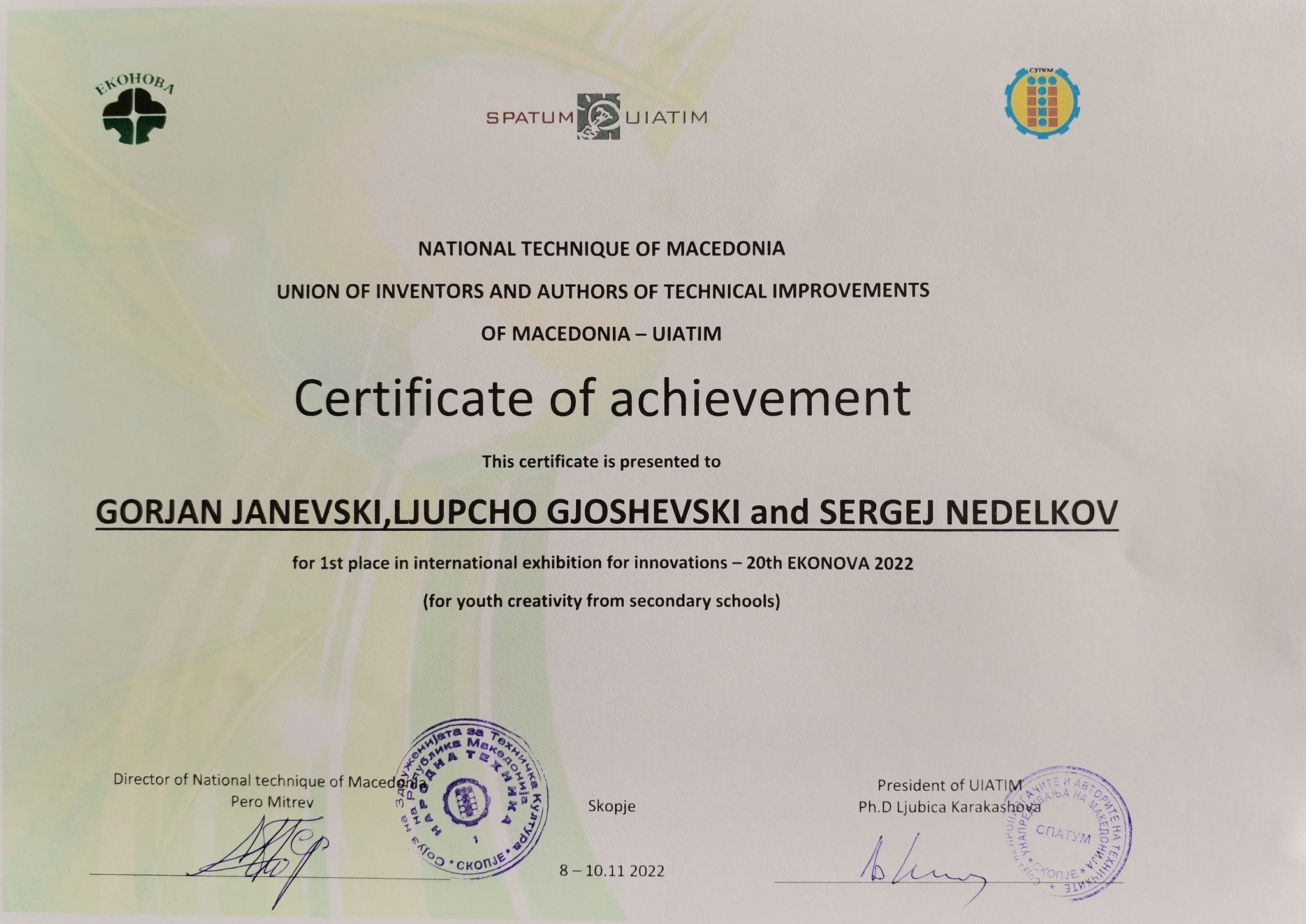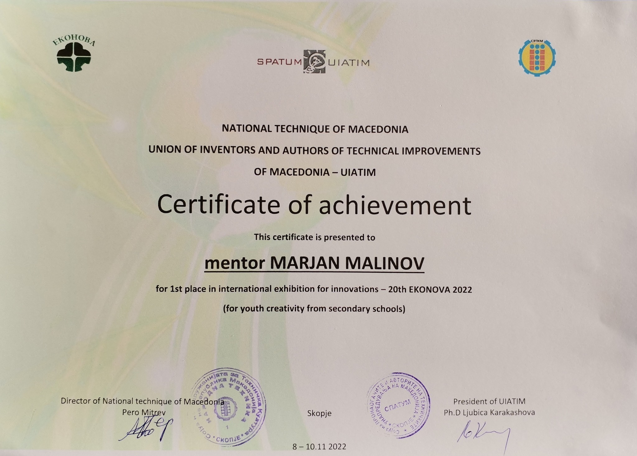 Двете манифестации се одржаа во Скопје на 08.11.2022 и 09.11.2022 година. Нашето училиште и оваа година зема учество на најголемата манифестација во Македонија поврзана со инвентивното и креативното творештво МАКИНОВА 2022 и ЕКОНОВА 2022, која е во организација на Сојузот на пронаоѓачите и автори на технички унапредувања на Македонија-СПАТУМ и Народна техника на Македонија.
