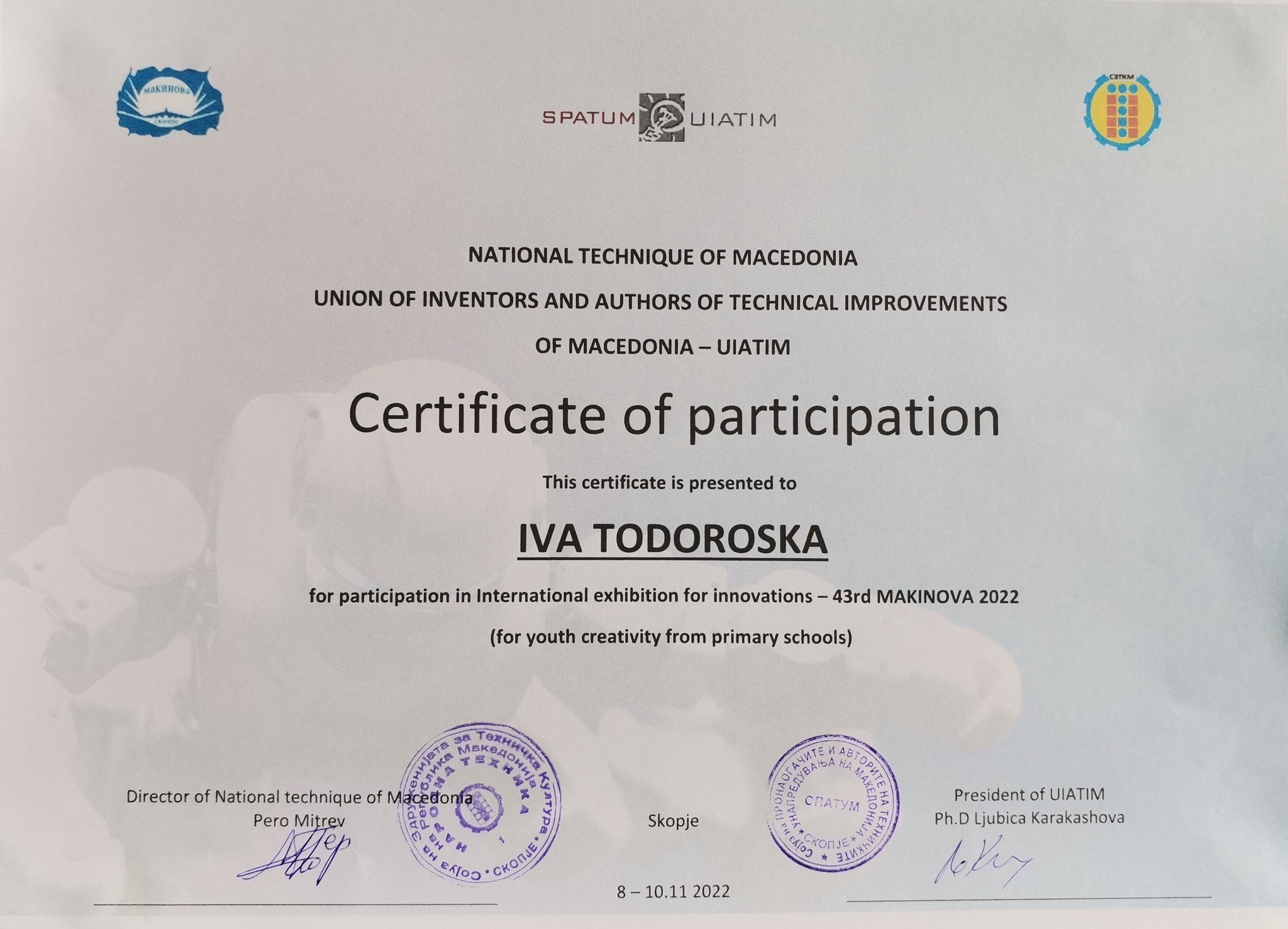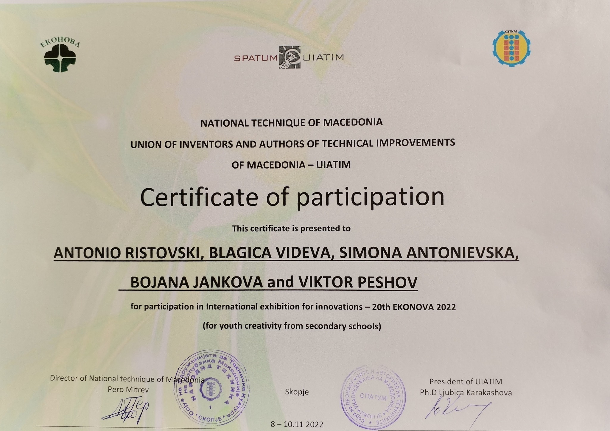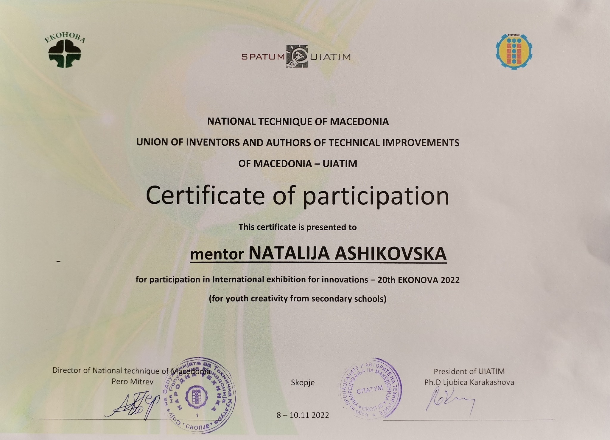 Двете манифестации се одржаа во Скопје на 08.11.2022 и 09.11.2022 година. Нашето училиште и оваа година зема учество на најголемата манифестација во Македонија поврзана со инвентивното и креативното творештво МАКИНОВА 2022 и ЕКОНОВА 2022, која е во организација на Сојузот на пронаоѓачите и автори на технички унапредувања на Македонија-СПАТУМ и Народна техника на Македонија.